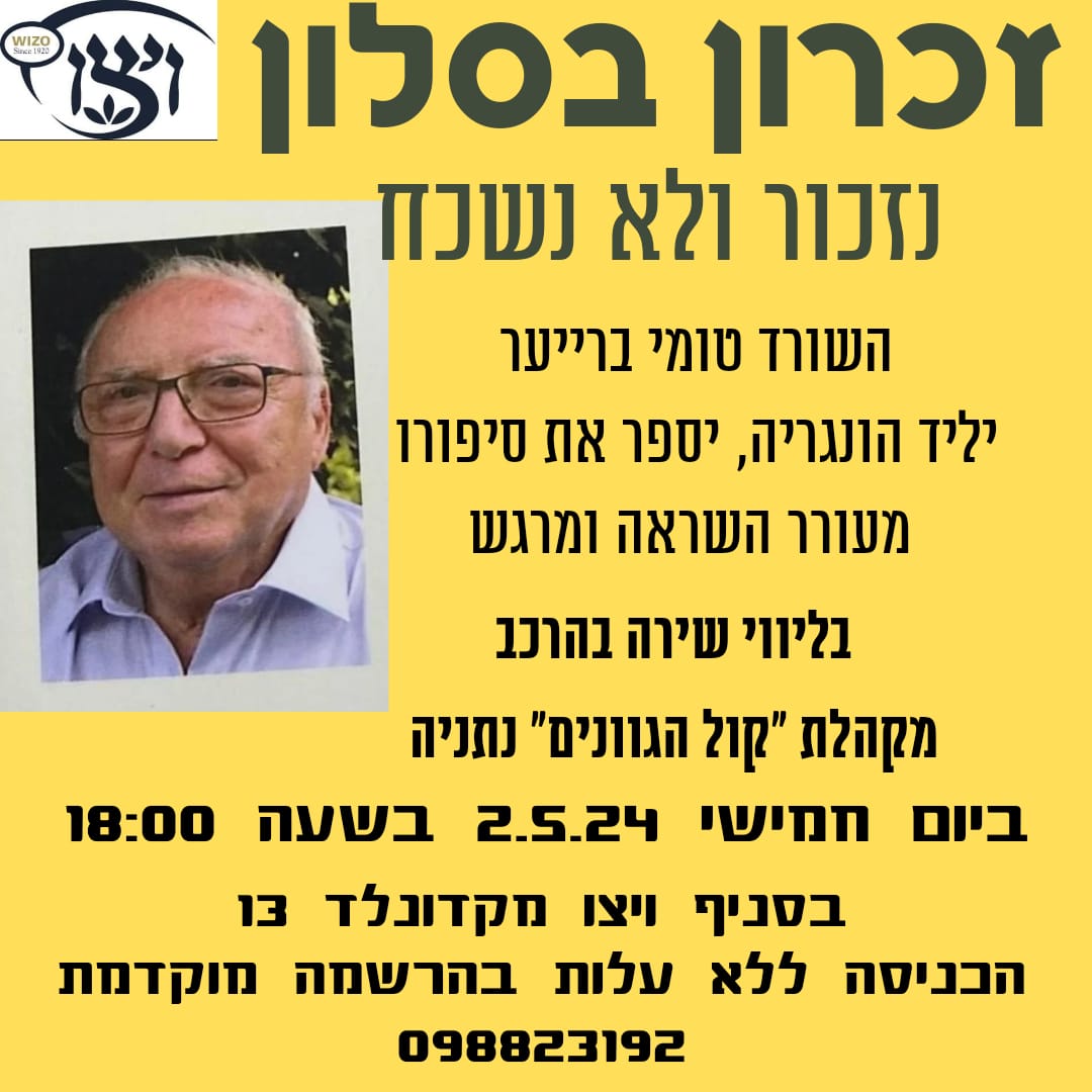 אירוע זיכרון בסלון לציון יום השואה והגבורה יתקיים בסניף ויצו נתניה במהלכו השורד טומי ברייער יליד הונגריה יספר את סיפורו מעורר ההשראה והמרגש. האירוע ילווה בשירה בהרכב מקהלת “קול הגוונים”. האירוע יתקיים ביום חמישי ה 2.5.24 בשעה 18:00 בערב בסניף ויצו נתניה, ברחוב מקדונלד 13 נתניה. יש להירשם מראש בטלפון: 09-8823192